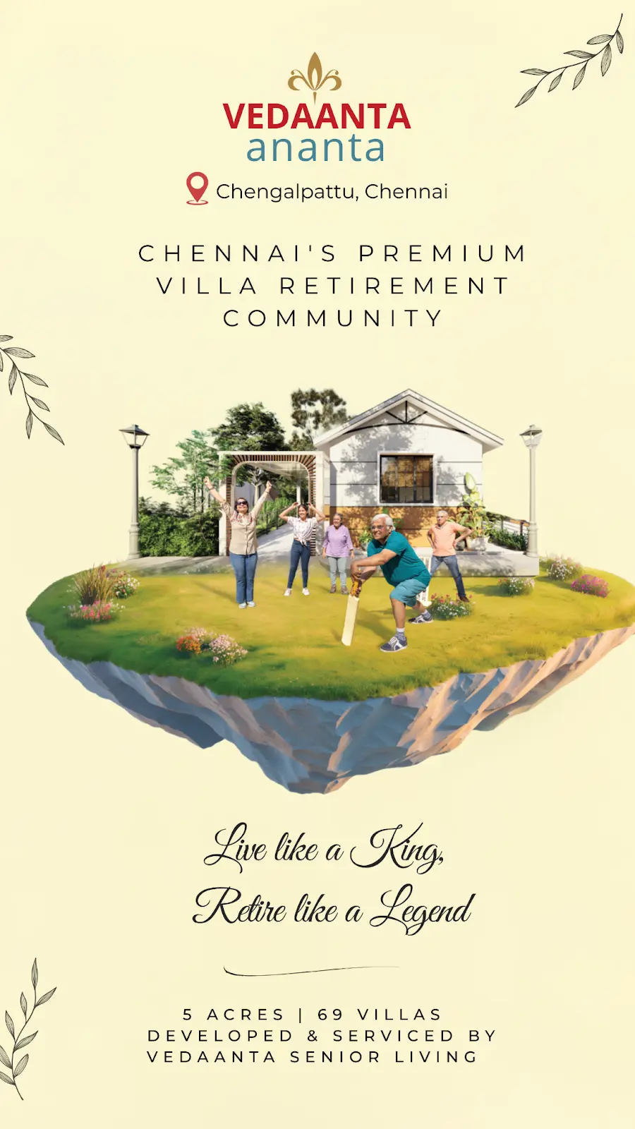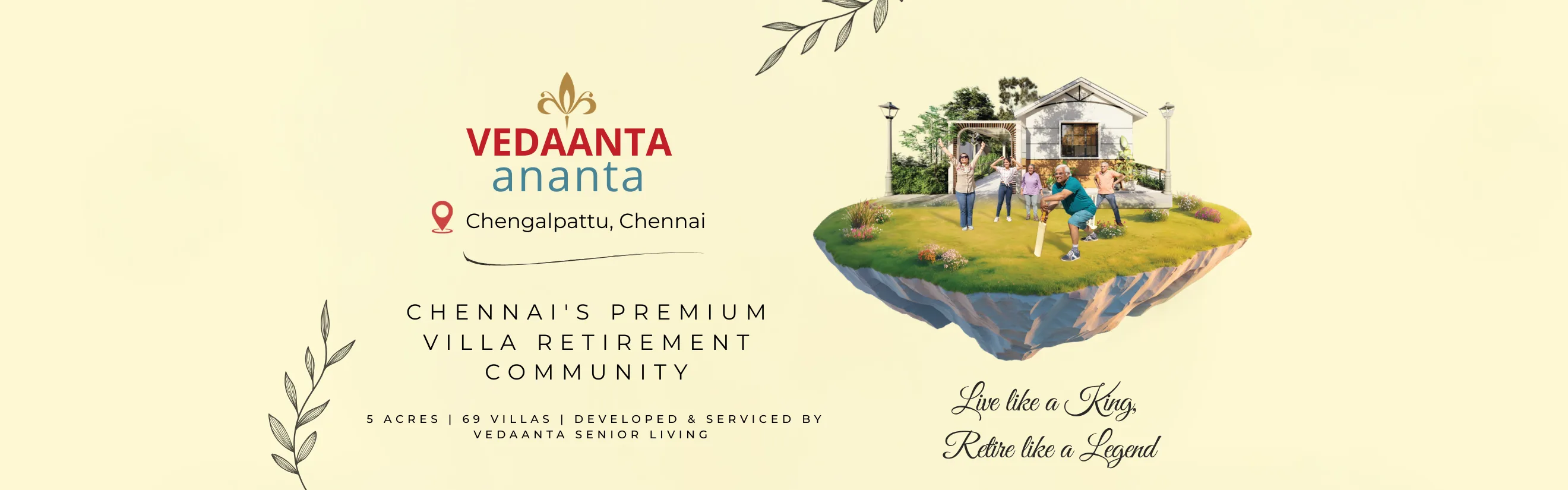 Vedaanta presents Vedaanta Ananta, a serene retirement villa community thoughtfully created for those who seek comfort, independence, and a joyful lifestyle in their golden years. Spread across 5 acres within the expansive 250-acre Sameera Universe, Ananta combines the charm of villa living with the assurance of Vedaanta’s trusted services. Close to Chennai yet surrounded by peaceful greenery, it offers a lifestyle that blends privacy, community, and modern convenience.